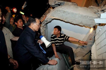 5月12日温总理抵达地震灾区四川省都江堰市,指挥抗震救灾工作。这是温总理在都江堰市一所医院的废墟中,透过缝隙向埋在里面的人喊话。