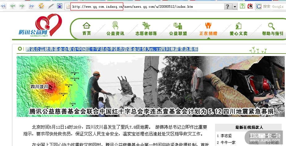 5月13日,瑞星公司监测到一个利用四川地震灾难诈骗钱财的钓鱼网站,该网站仿照腾讯网慈善频道,标题为“腾讯公益慈善基金会联合中国红十字总会李连杰壹基金计划为5.12四川地震紧急募捐”,其实这是黑客建立的钓鱼网站,其公布的募捐账号也是假冒的。瑞星安全专家提醒网民,献爱心的时候要多加注意,不要被假冒网站欺骗。