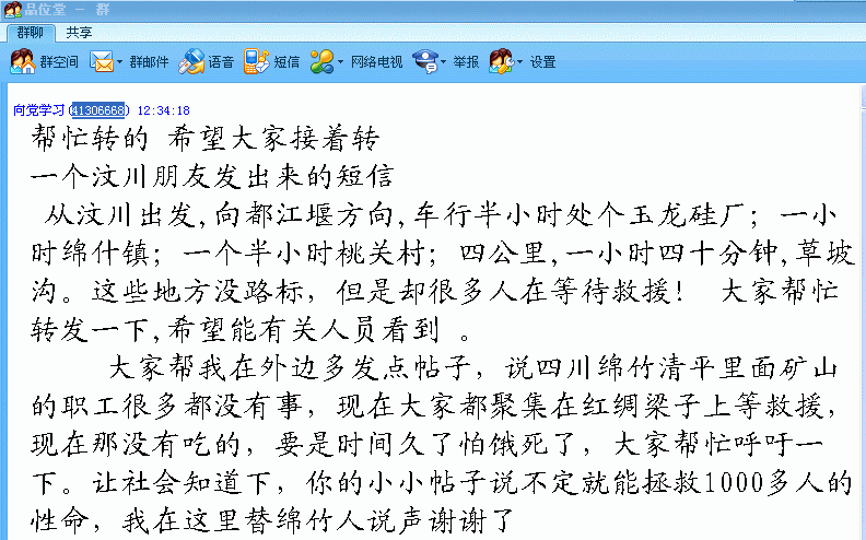 大家帮我在外边多发点帖子,说四川绵竹清平里面矿山的职工很多都没有事,现在大家都聚集在红绸梁子上等救援,现在那没有吃的,要是时间久了怕饿死了,大家帮忙呼吁一下。让社会知道下,你的小小帖子说不定就能拯救1000多人的性命,我在这里替绵竹人说声谢谢了