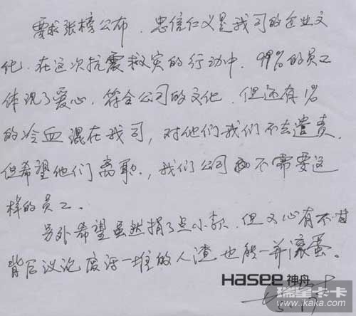 在这张印有神舟电脑徽记的纸上写道,“要求张榜公布,忠信仁义是我司的企业文化。在这次抗震救灾的行动中,99%的员工体现了爱心,符合公司文化,但还有1%的冷血者混在我公司,对他们我不去遣(谴)责,但希望他们离职,我们公司不需要这样的员工。”随后还写道,“虽然捐了点小款,但又心有不甘背后议论废话一堆的人渣也一并滚蛋。”批条的最后,还有吴海军的签名。