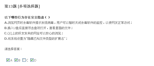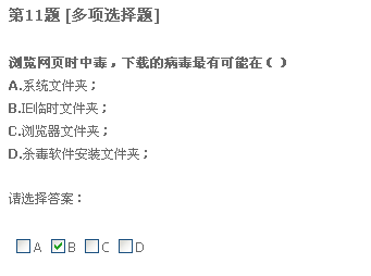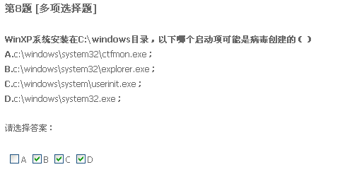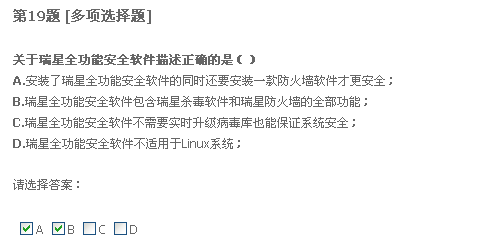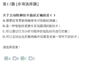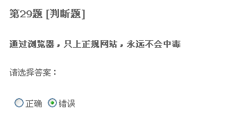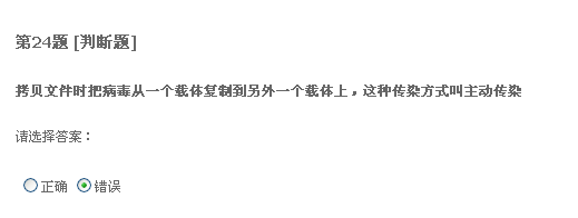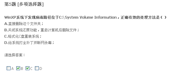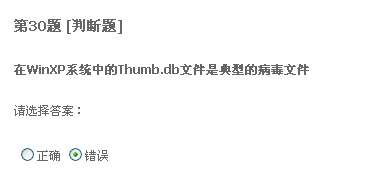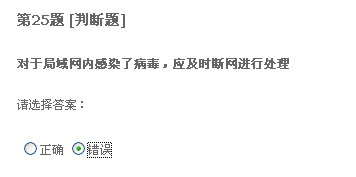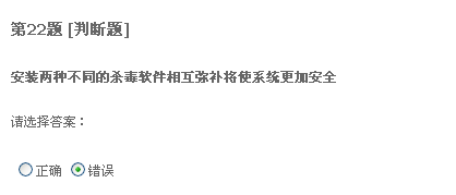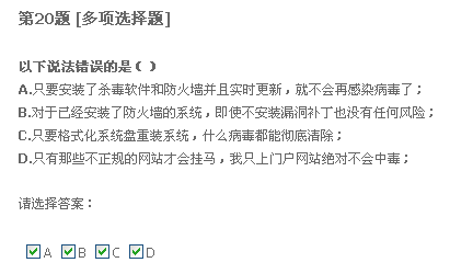 二十题,只要格式化系统盘重装系统,什么病毒都能清除。我觉得不正确。我以前遇到过一种情况,好像是中了冲击波还有好几种病毒,我把系统盘给格了,还是装不上系统。我就觉得格式化系统盘不能清除所有病毒,所以认为有错。不知道这题答案是什么。