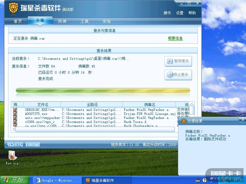 如图2,查杀一个45个病毒的压缩包以后,出现图三所示的情况