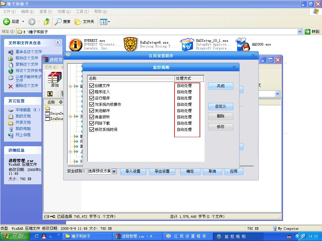 发现江民2009无论在打补丁,或安装程序时,主防都不提示。经研究发现江民的系统监控:加载驱动,创建文件;程序运行。=========处理方式:自动处理!!!