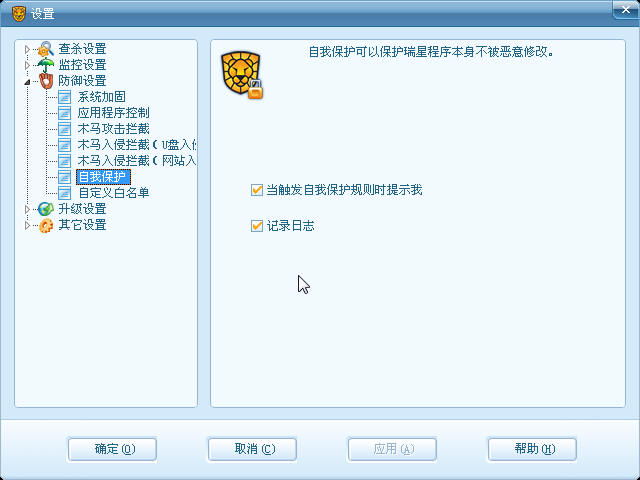 感觉这项有必要列出瑞星自我保护了哪些东东,若用户感觉不足可以自己再进行扩充。