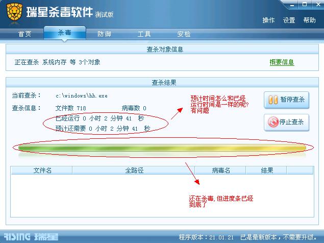 问题现象:使用快速查杀出现还在杀毒,但进度条已经到底了,还有已运行时间和预计时间是一样的
