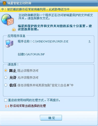 问题现象:在D盘下创建个AUTORUN.INF文件,主动防御提示了,我不做任何操作,让他按默认操作,最后还是成功创建了AUTORUN.INF文件