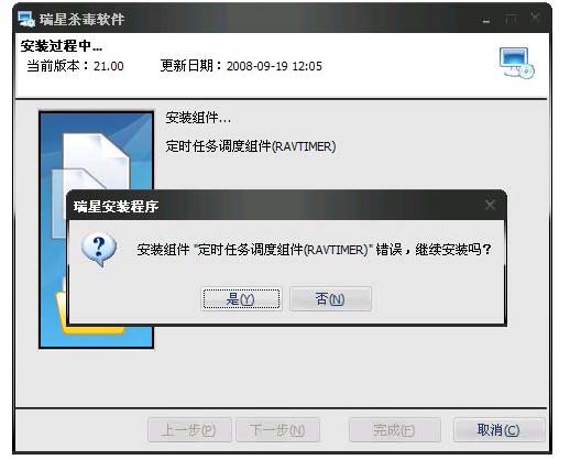 正常卸载瑞星2008并按提示重启电脑,由于原瑞星2008的安装路径为d:\program files\rising\rav下,为了不出现新的安装目录,故将2009亦安装至该目录。在安装时出现组件安装错误,如图: