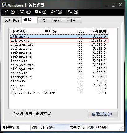 这是问题出现时的系统进程列表,可见只有瑞星任务栏图标运行着,其它进程则没有运行。至于为什么,请看下图: