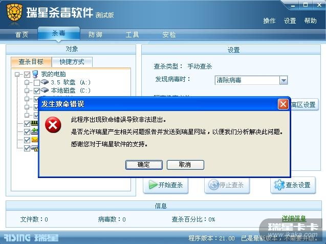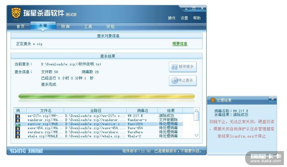 问题现象:清除压缩包病毒时右下方程序框文件名乱跳且无法清除病毒再次右键打开程序报错
