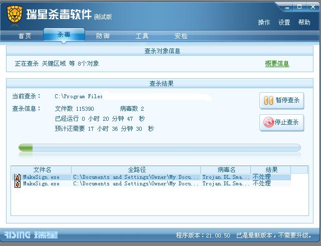 出现问题前的操作步骤:把此软件的可执行文件MakeSign.exe视为病毒并删除,但在杀毒记录中“结果”一项又显示为“不处理”