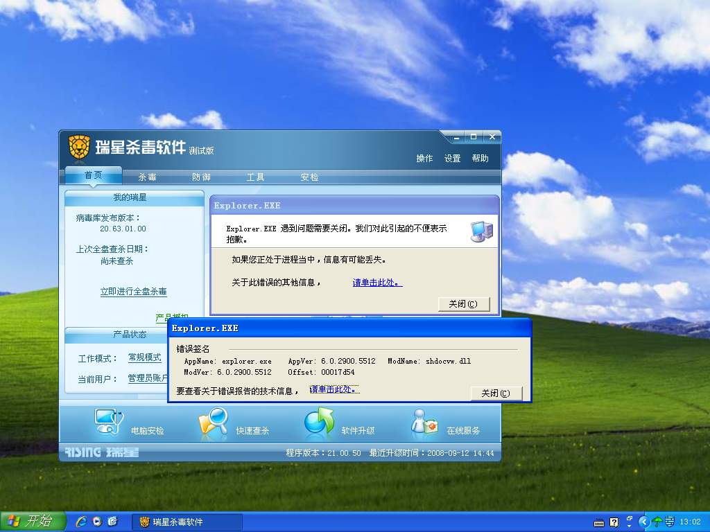 出现问题前的操作步骤:安装瑞星2009测试版,上网在线升级,其他没有任何操作。