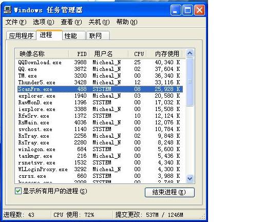 问题现象:手动操作“空闲时扫描”结束后,任务管理器中scanfrm.exe占用内存居高不下。