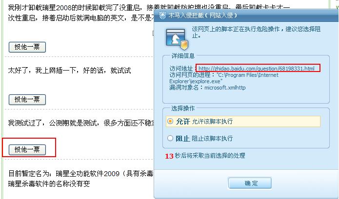进入百度知道,点击投他一票,网页木马防御便误报了。
