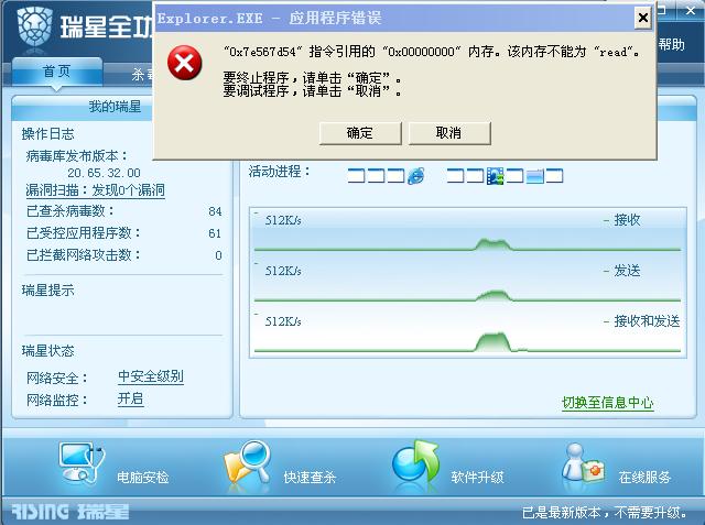 问题现象:昨天升级瑞星后,提示重启完成升级。今天早上开机后,瑞星加载完升级文件后就弹出explorer出错信息。