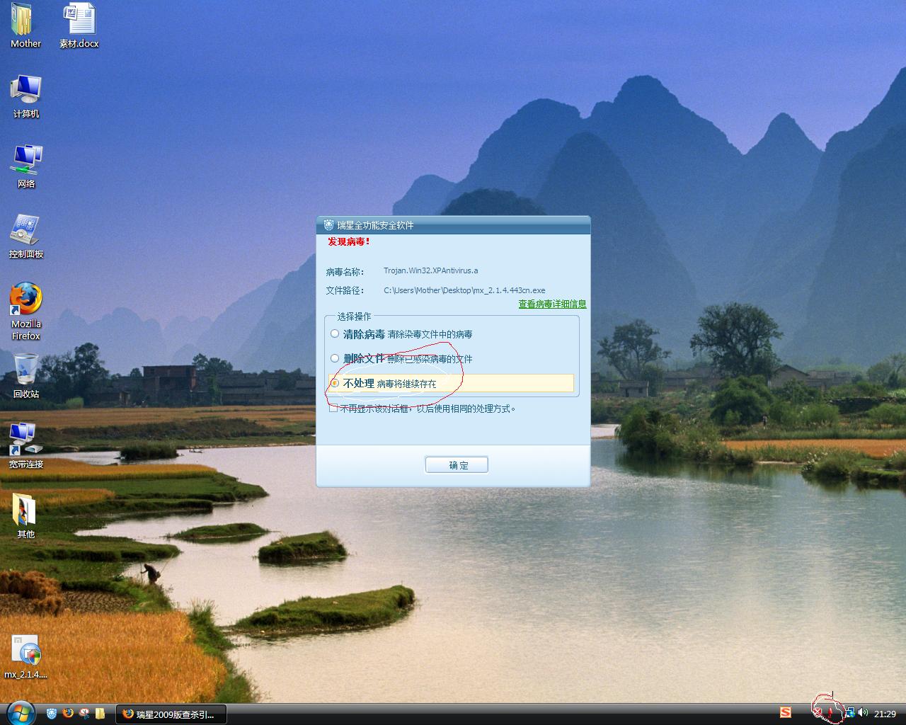 问题现象:我选择不处理还是把我的文件删除了 另外瑞星是不是对火狐下载有嵌入式杀毒