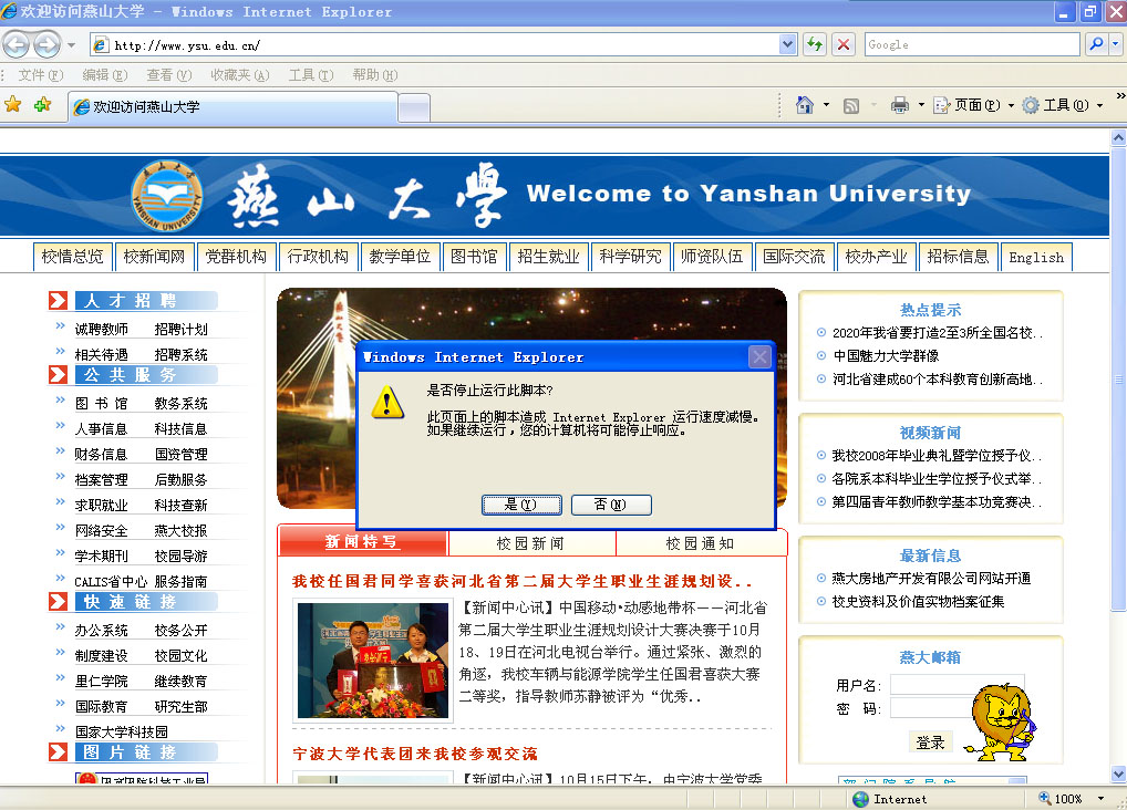问题如前,将浏览器安全选项中活动脚本项禁用后,不在出现前面的对话框,但是IP网关不能登陆(我们校园网内采用透明网关上外网,不用代理服务器),校园通知内容不能显示,一些网页图片不能显示,启用活动脚本则现象如前所述。用IE6或IE7都不行,清理插件无作用。谢载2009测试版后就没问题了,安装08版也无问题,看来我们学校明年以后必须改用卡巴了