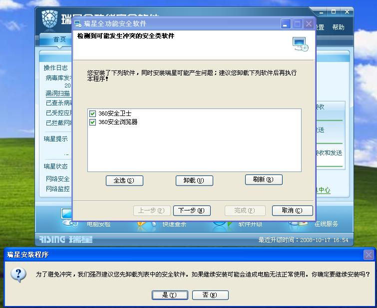 安装瑞星全功能安全软件时,会出现与360安全卫士冲突的提示,建议卸载。请看下图: