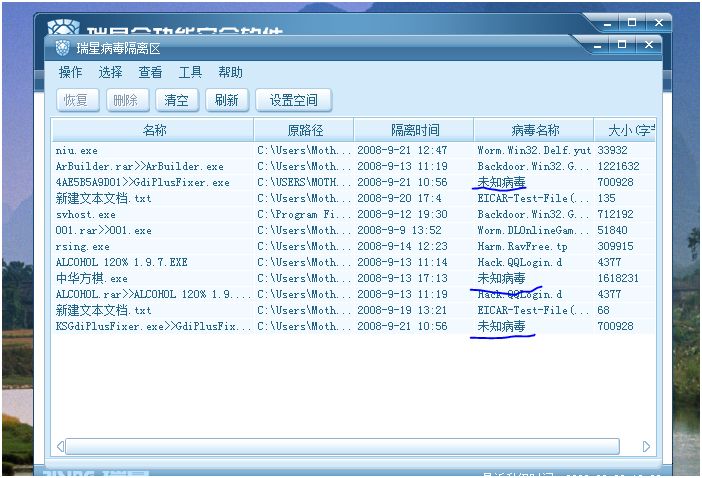 我恢复其中一个文件  后瑞星  立刻报毒  再看隔离区  病毒名被报出了