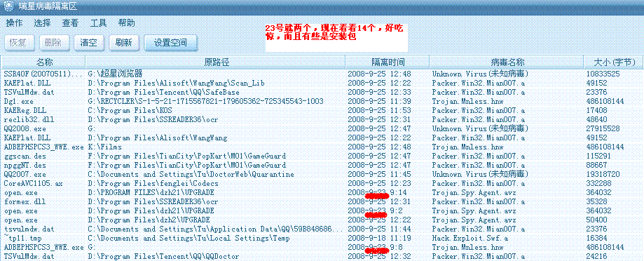 问题现象:用瑞星2008没毒,09昨天还是2个,今天在扫描一下哇,14个