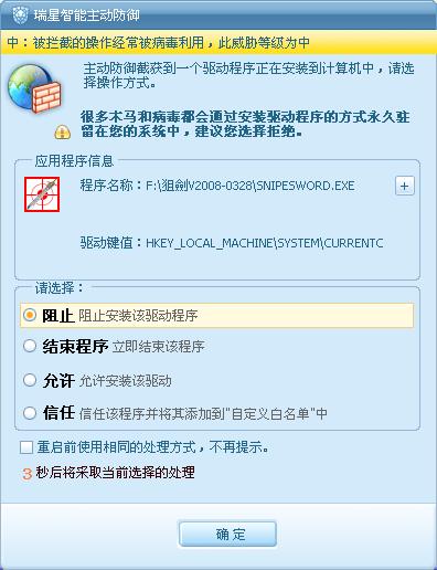 主动防御的拦截提示设置一个暂停倒计时会更好,就像防火墙提示一样.这样可以看清楚具体的可疑程序动作、路径及名子,有利于判断是否是自己想要的操作.