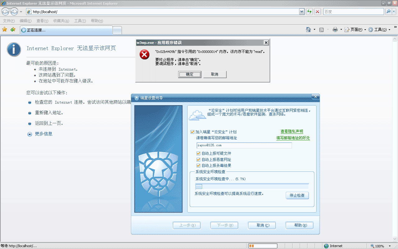 问题现象:之前提出RAV2009造成IIS的w3wp.exe组件出错,卸载RAV2009后问题立即恢复,安装RIS2009重启检测时(未出现桌面),打开IE访问localhost,提示w3wp.exe内存不能为written,ASP网页无法打开。一旦正式版发布时此问题未能被解决,将造成安装瑞星杀毒软件的Web服务器大面积崩溃。
