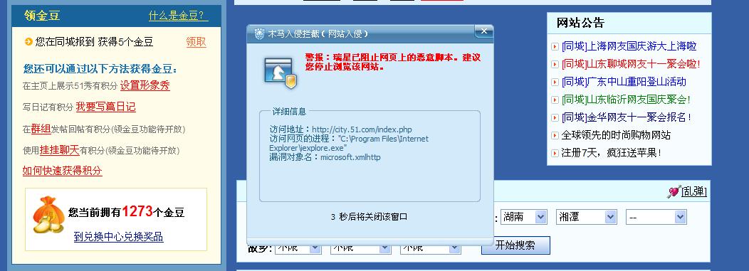 问题现象:51.com领取金豆有恶意脚本 漏洞对象名:microsoft.xmlhttp