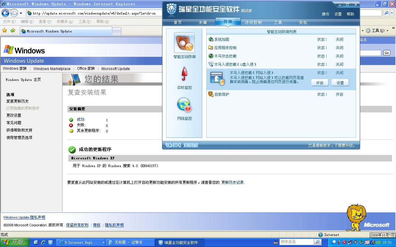 问题现象:操作系统更新到最后留下Windows 搜索 4.0 (KB940157)无法更新,但将瑞星全功能安全软件2009测试版所有监控功能禁用后,就可以更新了。随后我又将其卸载,重新开启所有监控,还是无法更新。