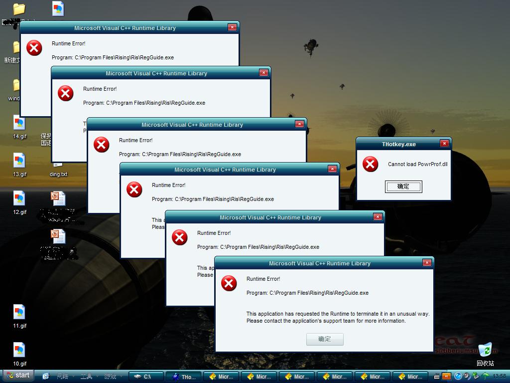 问题现象:待机一段时间后,唤醒机器,卡了很长时间没反应,硬盘一直转,大约5分钟左右进入桌面,看到一大堆RegGuide.exe的报错窗口(这个可能是激活界面那个程序),如图所示