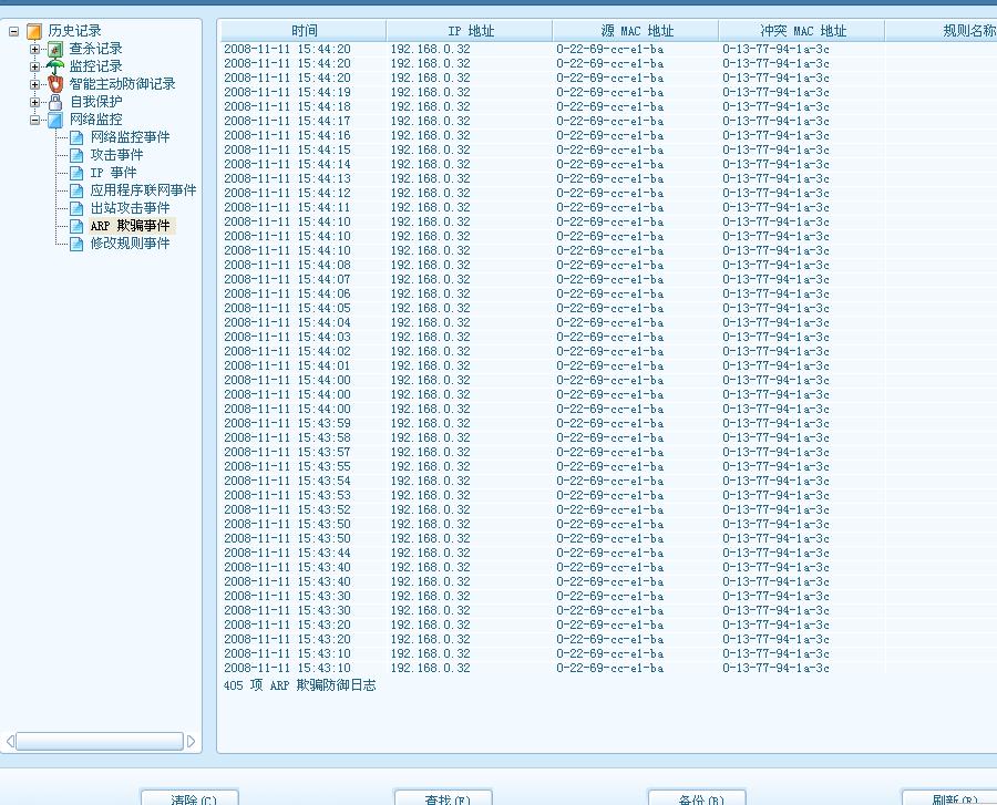 问题现象:开启arp欺骗防御后,笔记本的网卡与无线网卡的MAC地址冲突,本机在局域网内的ip为:192.168.0.32,网卡的MAC地址为00-13-77-94-1A-3C,无线网卡的mac地址为00-22-69-CC-E1-BA,开启arp欺骗防御后历史记录中显示这两个地址冲突下面是截图:必填