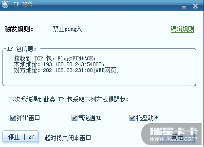 我这里经常被ping,我想知道每次被ping时的情况,就把防火墙的禁止ping入的报警开了,以前单用防火墙时正常,可是今天安装了全功能ping报警就不出来了,怎样设置报警都不出来。(我已经设置完毕),全功能已是最新。