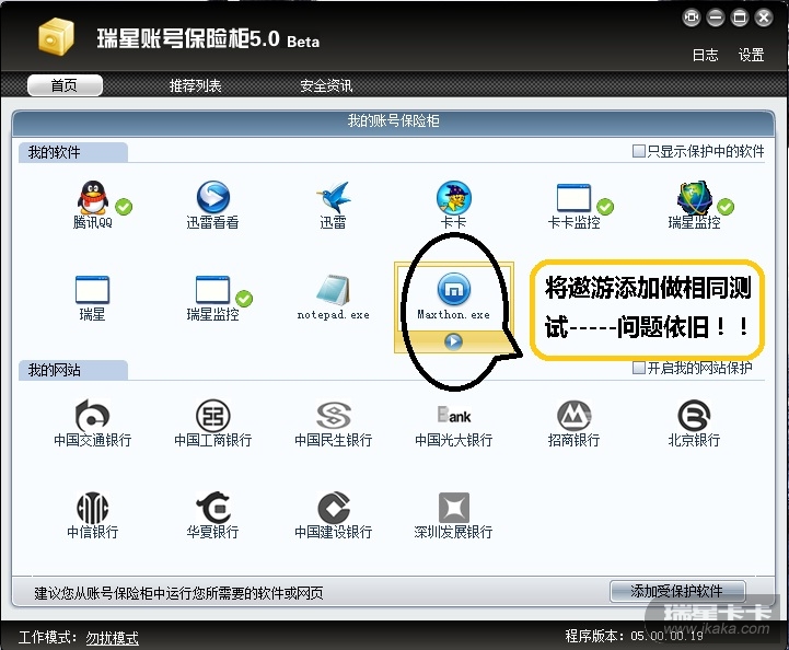 操作:将记事本程序加入 保险柜 保护,然后运行记事本,随之运行拦截软件