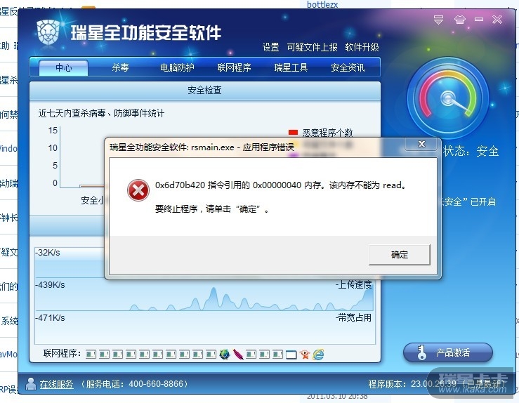 今天一看到瑞星说免费了,就立刻下载了RIS,安装好后,主界面上有修复,点击修复电脑防护,就弹出窗口报错,升级完毕后操作其他设置选项后,只要点应用或者确定,就弹窗报错,都是一个错误,不知道是怎么回事,操作系统是WIN7PRO,IE9RC,上图如下: