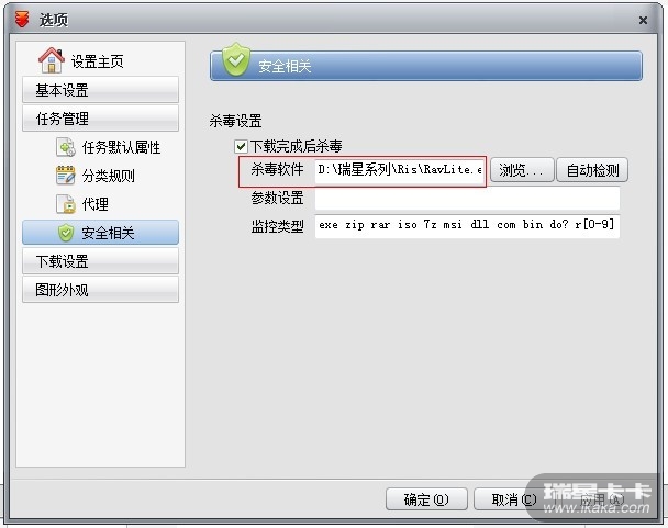 可以手动关联的,在快车添加杀毒软件的位置,指定路径给瑞星安装目录下的ravlite.exe。