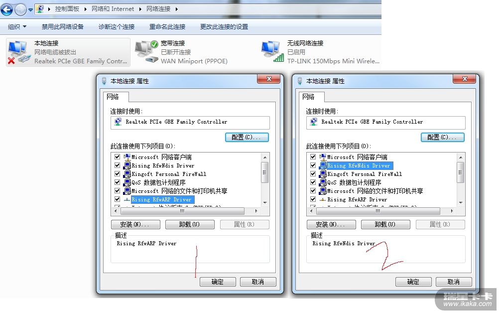 我继续查找原因。在网络和共享中心--更改适配器设置中的 “本地连接” 和 无线网络连接“单击其一右键--属性中 都带有 下图中选中的 两项。