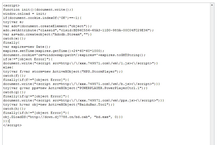 上图中红色框中,我们看到有3个js脚本(已失效),有效地址为:http://down.dj7788.cn/bd.cab和http://down.dj7788.cn/bd.exe。