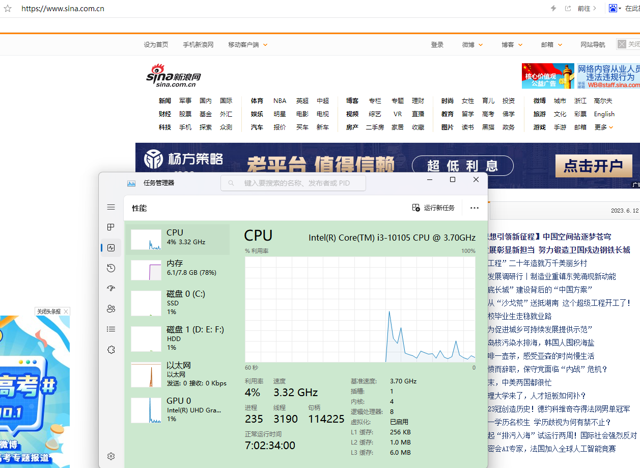 最近几天发现电脑总是有时候有点卡,开始没有留意有什么规律,今天的时候才发现,只要打开“新浪”官网就会感觉到电脑卡坤,CPU资源明显升高,并且会到100%的现象,经过多次观察均为如此,不知道是什么原因。