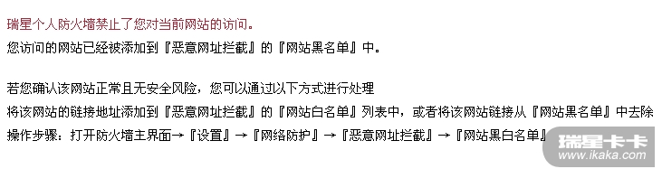 楼主您好,您按照楼上的提示完成添加进黑名单之后,如果再次打开该网页,会出现瑞星的如下提示信息: