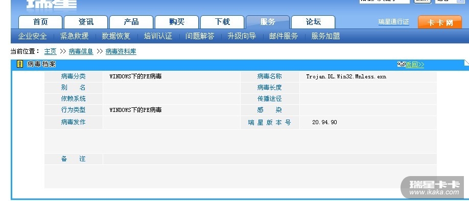 Trojan.DL.Win32.Mnless.exn  这个是个什么病毒呀??瑞星杀了7次每次都能查出来 但是就是杀不掉他。 不晓得对电脑会有什么影响吗? 瑞星病毒库里也找不到这病毒的信息 ,百度也搜不到,瑞星只是说是说明Windows下的PE病毒,也不晓得什么意思,关键不知道这病毒对电脑的影响大不大,出了系统重装还有什么比较有效的方法能方便的删除这病毒吗。。 我网上搜了下,用的360安全卫士强制删除这病毒文件,可是一强制删除就蓝屏,试了2次都这样。希望对大侠们都来看看教我解决下问题。。。。谢谢各位了!!!!!!!  我把附件传上来看下吧