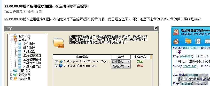瑞星卡卡安全论坛企业产品讨论区瑞星2010新品体验挑战专区 转BBA365在卡饭提到: 22.00.00.68版本应用程序加固,在启动ie时不会提示