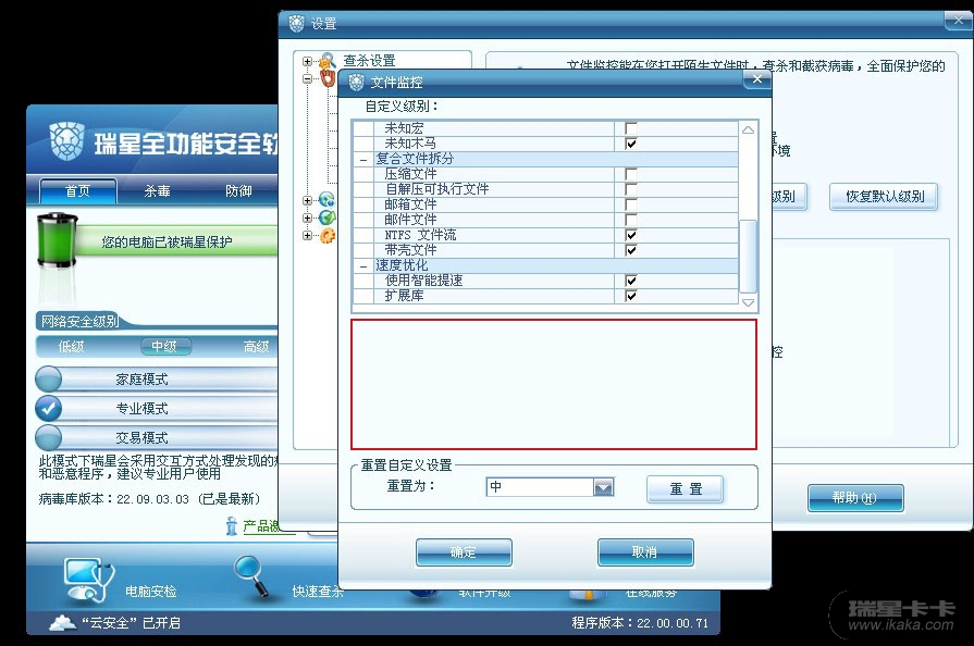 文件监控启发没多少用处(文件监控启发很占内存),瑞星2010有主动防御,木马行为防御才是王道。