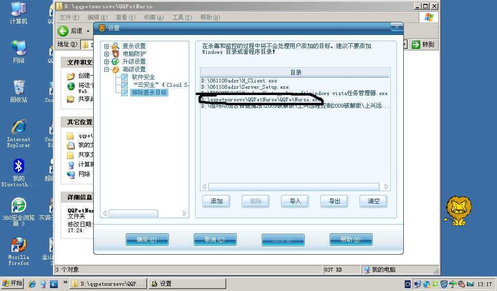 汗!!!!前天我的2009升级到2010了,昨天加了个排除杀毒目标,结果文件监控不清除,可空闲时段和全盘查杀时却报毒并清除.
