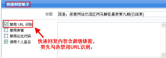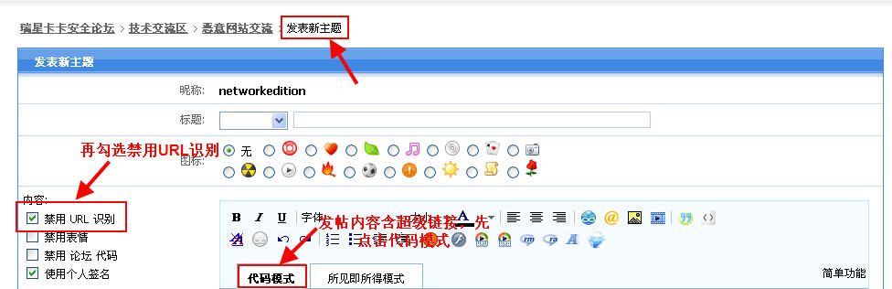 5、求助者在所发帖中如含有链接地址,一律要禁用url链接,以防他人误点而导致系统中毒。由于默认发帖是所见即所得模式,如直接发帖后,原帖肯定会包含有超级链接。凡是所发帖或回帖中有超级链接内容,先点击代码模式,勾选左侧的禁用URL识别后,再发表或回复帖子。具体操作可见下图: