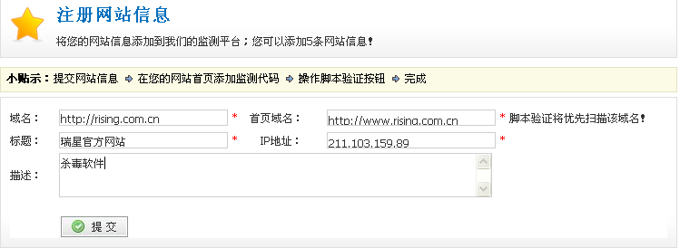 在填写完上述截图瑞星通行证的用户名和密码点击登录后,首先,要加入瑞星云安全网站联盟,需要提交网站信息,在这里我们以www.rising.com.cn为例,讲解如何填写网站注册信息。