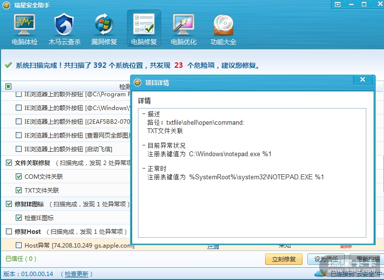 这又是………………第一个TXT文件关联,我确认我系统原有值是对的。后一个嘛……Win7 64bit不是不能执行16位的COM文件了么,这样修复后,不会有什么后果吧?反正我也没点修复。