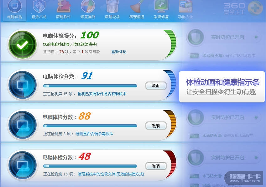 、体检增加了健康指示条和体检动画,让枯燥的安全检查变得生动有趣