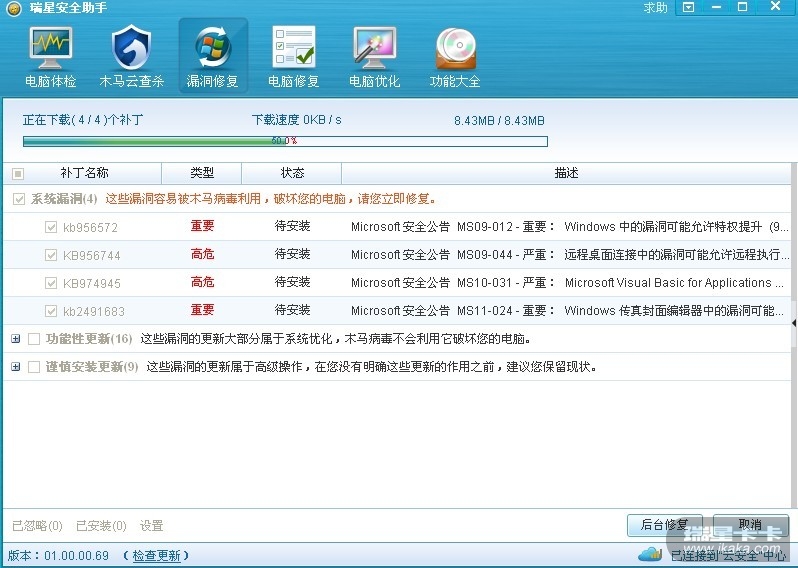 用安全助手修复漏洞时,修复到百分之五十的时候,停止了,不在下载了,这是为什么啊?