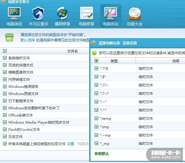 如图所示,瑞星安全助手也可以根据指定文件类型进行清理。关于其他注册表清理建议已收集,感谢您的支持。