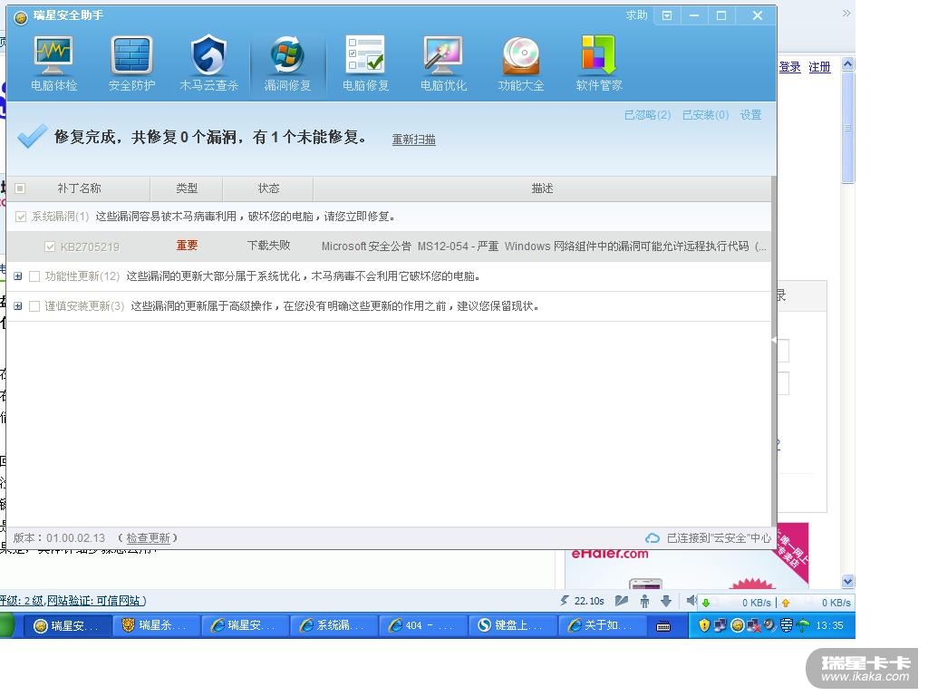 瑞星安全助手提示:发现高危漏洞kb2705219,点击立即修复后,下载失败。