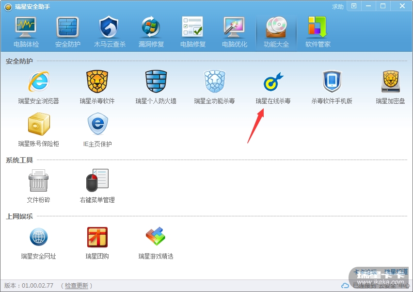 把安全助手里面的在线杀毒功能图标 撤掉吧 反正点进去也没这个功能了