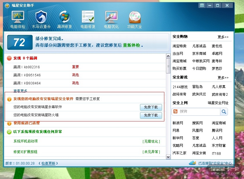 检测时还要安装瑞星防火墙或查杀软件。。。